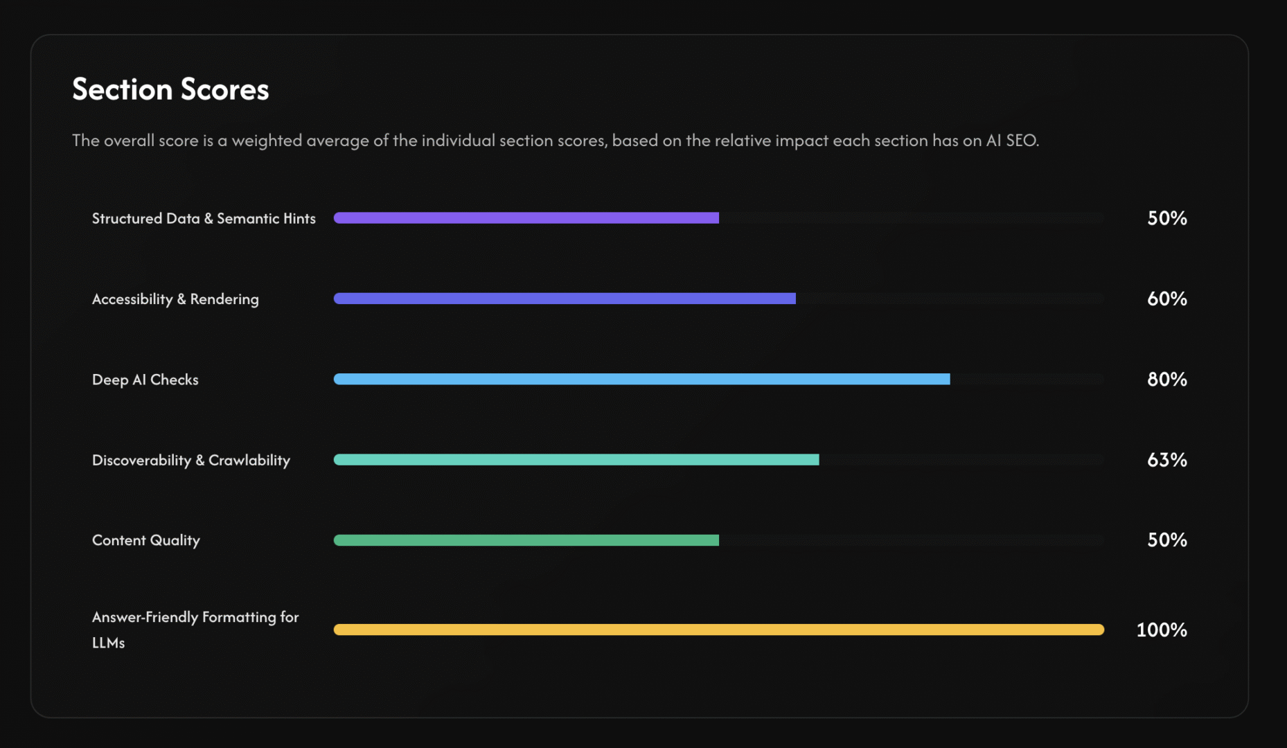With one click, the tool analyzes their site across dozens of factors — from technical SEO and content structure to schema markup, Core Web Vitals, and mobile performance.